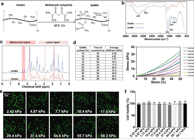 圖1、具有不同硬度的GelMA水凝膠的表征。(a)紫外線交聯GelMA水凝膠制備方案。(b)通過FTIR-ATR分析明膠和GelMA的化學結構。(c)1 H NMR(D2O)明膠和GelMA的核磁譜。粉紅色和淡粉紅色分別代表甲基丙烯酰和賴氨酸信號。(d)GelMA組成、交聯時間和每組的平均剛度。右圖顯示了代表性的壓縮應力應變曲線。C和T分別表示GelMA含量和交聯時間。(e)接種在水凝膠上的BMM的活/死染色顯示均勻分布,所有組中幾乎沒有死細胞。(f)通過MTT測量細胞活力(n=3)。深色虛線代表平板上細胞的活力。