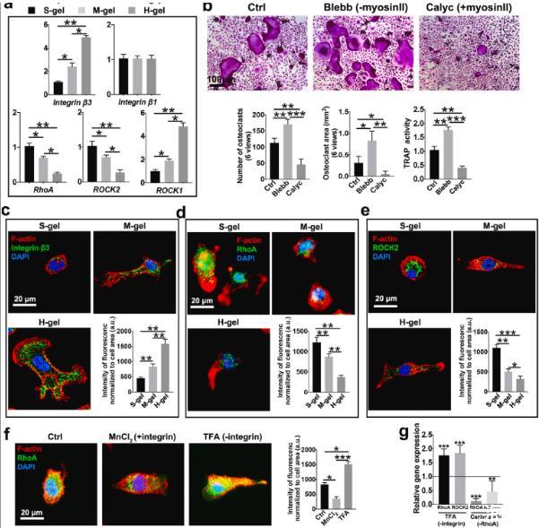 圖2、H-gel促進整合素β3表達并減弱RhoA信號傳導。(a)指定水凝膠上的相對機械轉導mRNA表達(n=3)。(b)M-gel組培養的破骨細胞的代表性TRAP染色圖像。對破骨細胞數量(n=6)、破骨細胞面積(n=6)和TRAP活性(n=3)進行量化。Blebb:用blebbistatin培養細胞以抑制肌球蛋白II活性。Calyc:用花萼蛋白A處理細胞以激活肌球蛋白II活性。(c)具有不同硬度的水凝膠上RANKL刺激的細胞中F-肌動蛋白(紅色)、整合素β3(綠色)和細胞核(藍色)熒光染色的代表性圖像(n=6)。(d)RANKL刺激細胞在所示水凝膠上染色的F-肌動蛋白(紅色)、RhoA(綠色)和細胞核(藍色)的熒光顯微照片和分析。(e)在不同硬度的水凝膠上孵育BMM 3天后,用F-肌動蛋白(紅色)、ROCK2(綠色)和細胞核(藍色)染色的細胞的代表性免疫熒光圖像和分析(n=6)。(f)F-肌動蛋白(紅色)、RhoA(綠色)和細胞核(藍色)的免疫熒光染色和分析。將細胞在96孔玻璃板上孵育。氯化錳2、整合素激活劑。TFA,整合素抑制劑。(n=6)。(g)用所示抑制劑處理后RhoA和ROCK2的相對基因表達。