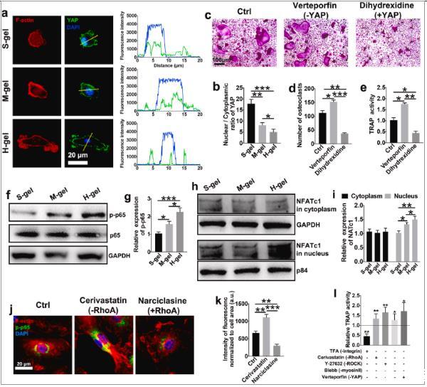圖3、H-gel損害機械感應,從而促進NF-κB信號傳導。(a)YAP(綠色)、F-肌動蛋白(紅色)和細胞核(藍色)染色的代表性免疫熒光顯微照片。線圖顯示黃色箭頭指示的區域的YAP和DAPI共定位。(b)YAP核定位通過核/細胞質熒光強度的比率來測量。(n=6)。(c)用維替泊芬(YAP抑制劑)或二羥西定(YAP激動劑)處理的破骨細胞的代表性TRAP染色圖像。細胞在M-gel組上孵育。(d)量化與指定試劑一起孵育的破骨細胞的數量。(e)測量TRAP活性。(f)在RANKL存在下在所示水凝膠上孵育15分鐘后,對單核細胞/巨噬細胞磷酸化p65的相對水平進行蛋白質印跡分析。(g)p-p65水平與總p65水平的量化(n=3)。(h)檢測細胞質(GAPDH作為細胞質加載對照)和細胞核(p84作為核加載對照)中的NFATc1水平,并(i)進行定量(n=3)。(j)RANKL刺激的BMM中F-肌動蛋白(紅色)、p-p65(綠色)和細胞核(藍色)的代表性免疫熒光染色。西立伐他汀,RhoA抑制劑。水仙環素,RhoA激活劑。(k)p-p65熒光強度的量化,標準化為細胞大小(n=6)。(l)在H-gel上與M-CSF和RANKL一起孵育3天后,用所示抑制劑處理細胞過夜,然后進行TRAP活性測量。