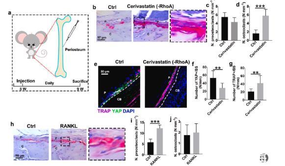 圖4、抑制力傳導促進骨膜上破骨細胞的生成。(a)骨膜注射西立伐他汀和RANKL的圖示。治療1周后,取出股骨并用TRAP和YAP染色以評估力轉導和破骨細胞發育。(b)代表性TRAP染色圖像,右圖顯示西立伐他汀組中黑色輪廓區域的放大。(c)骨膜骨表面前破骨細胞和(d)多核破骨細胞的定量(n=6)。(e)TRAP(紫色)、YAP(綠色)和DAPI(藍色)的代表性免疫染色圖像。CB和P代表皮質骨和骨膜。(f)骨膜上YAP+細胞的數量(n=6)。(g)TRAP+的數量骨膜上的細胞(n=6)。(h)RANKL處理的骨膜的TRAP染色圖像,右圖顯示RANKL組中黑色輪廓區域的放大。(i)骨膜骨表面上的前破骨細胞和(j)破骨細胞的定量(n=6)。P和C分別代表骨膜和皮質骨。