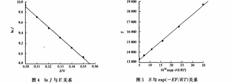 根據(jù)圖3求算的不同電位E下的lnJ與E關(guān)系,如圖4所示。從圖4可知,兩者呈現(xiàn)較好的線性關(guān)系,其斜率為~19.88,截距19.85,根據(jù)式(12)可求得β=0.511,=3.16×10-10s-1.又據(jù)圖3求算出各直線斜率S與exp(~EF/RT)的關(guān)系,如圖5所示。從圖5可知,兩者呈現(xiàn)較好的線性關(guān)系,其斜率為1.79×1012,截距12329,根據(jù)式(10)可求得k2=2.68×10-4L·(mol·s)~1,k0-1=0.0459s-1。