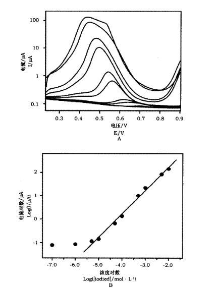 循環伏安圖結果表明石墨烯可成功修飾到電極表面,且獲得了碘離子在該電極表面明顯的氧化峰電流信號,這些均為建立基于石墨烯修飾電極的電化學檢測碘離子方法奠定了堅實基礎。在此基礎上,獲得石墨烯修飾電極對碘離子的響應范圍為1×10-7至1×10-2mol·L-1,線性范圍為5×10-6至1×10-2mol·L-1,檢出限為5×10-6mol·L-1。進一步將其用于食鹽樣品中碘的測定,且結果滿意。這種方法具有電極制作簡單、響應范圍寬、檢測時間短、選擇性高、重現性好等優點,為食鹽中碘含量的檢測提供了一種新途徑。除可用于食鹽中碘含量的檢測外,該方法還有望進一步用于其它含碘食品的測定。