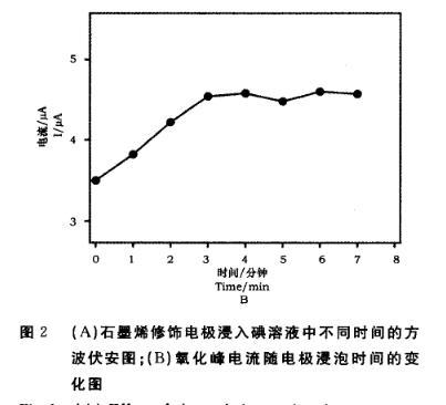 圖2(A)石墨烯修飾電極浸入碘溶液中不同時間的方波伏安圖;(B)氧化峰電流隨電極浸泡時間的變化圖