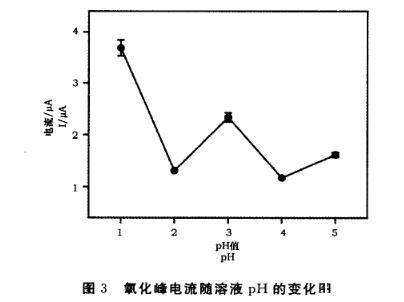 圖3為1×10-4mol·L-1碘化鈉(支持電解質為0.1mol·L-1緩沖)在石墨烯修飾電極上的氧化峰電流隨溶液pH的變化圖。當溶液pH為1.0時,獲得的碘離子的氧化峰電流最大。因此,后續實驗選擇最佳pH為1.0的條件下進行碘離子的檢測。