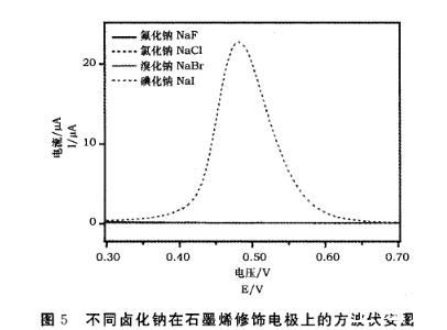 圖5不同鹵化鈉在石墨烯修飾電極上的方波伏安圖