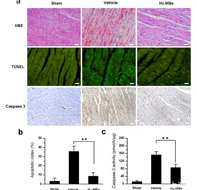 圖5、H2-MBs保護心肌結構并減少心肌細胞凋亡。(a)來自接受假手術處理、車輛處理或H2-MB處理的大鼠的心臟切片的組織學分析,這些大鼠經過30分鐘缺血和24小時再灌注;這些切片的H&E染色如圖所示(上排)。接受對照微泡MB的大鼠心臟在缺血區顯示明顯出血和壞死(上排,中間),但H2-MBs處理的大鼠的心肌損傷減輕了(上排,右側)。進行了TUNEL染色以檢測心肌細胞的凋亡(中排),發現接受車輛MB的大鼠中TUNEL陽性細胞的數量顯著增加(中排,中間)與接受假手術處理的大鼠相比(中排,左側)。接受H2-MBs的大鼠顯示TUNEL陽性細胞數量顯著減少(中排,右側)。進行了免疫組化染色以檢測caspase-3的表達(下排),發現接受對照微泡MB的大鼠心肌中的caspase-3表達相對較高(下排,中間)與接受假手術處理的大鼠相比(下排,左側)。接受H2-MBs的大鼠顯示caspase-3表達減少(下排,右側);刻度條=50μm。(b)通過計算五個高倍視野中TUNEL陽性核的百分比來繪制凋亡指數圖,顯示H2-MB處理的大鼠中TUNEL陽性核的數量顯著減少與車輛組相比(n=5)。