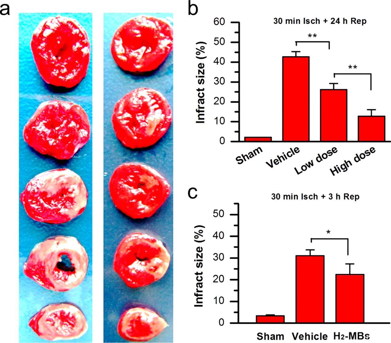 圖3、H2-MBs預防心肌梗死。(a)給予對照微泡(左)或H2-MBs(右,高劑量)處理的大鼠經TTC染色的心肌連續切片的代表性圖像。被染色陽性(紅色)的組織代表活力心肌。未染色陽性(白色)的心肌代表梗死組織。(b)對于接受假手術處理的、接受車輛處理的或接受H2-MB處理的大鼠(低劑量,每只大鼠4×109氣泡;高劑量,每只大鼠2×1010氣泡)在LCA缺血30分鐘和再灌注24小時后的心肌梗死面積的定量測定。接受H2-MB處理的大鼠顯示出INF/LV顯著減少(n=7)。*P<0.05,**P<0.01。數據表示平均值±s.d。(c)對于接受假手術處理的、接受對照MB處理的或接受H2-MB處理的大鼠在LCA缺血30分鐘和再灌注3小時后的心肌梗死面積的定量測定;每只H2-MB處理的大鼠使用2×1010個H2-MBs。發現了類似的保護作用(n=5)。