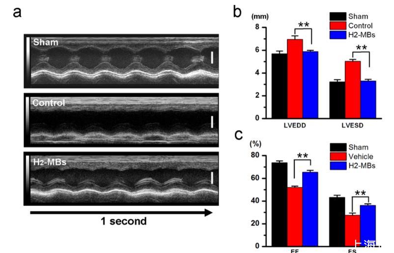 圖4、H2-MBs減少不良的LV重塑。(a)接受假手術處理(假手術)、缺血再灌注對照微泡處理或缺血再灌注H2-MBs處理的大鼠的代表性M模式超聲心動圖像。對每組的M模式超聲圖像的測量是在缺血再灌注后48小時進行的。使用裝備有MS-250掃描頭探頭的Vevo 2100系統進行成像,掃描速度為1000 Hz,頻率為21 MHz。刻度條(垂直),4 mm。(b)基于超聲心動圖像,確定了LV尺寸,包括左室舒張末期直徑(LVEDD)和左室收縮末期直徑(LVESD)(n=5)。**P<0.01。數據表示平均值±s.d。(c)與對照組相比,H2-MB處理的大鼠的心臟收縮功能(FS%)和射血分數(EF%)顯著改善(n=5)。