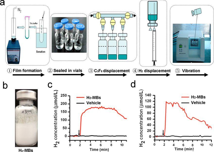研究簡介:心肌缺血再灌注損傷常見于心臟血流恢復后,如在心臟病發作后的血液再通或心臟手術后。這種損傷會導致組織破壞,可能引起心力衰竭。損傷的一個主要原因是活性氧自由基(ROS)的過度產生,特別是在再灌注的最初幾分鐘內。ROS的產生觸發線粒體通透性過渡孔的開放,導致細胞死亡程序、微血管功能障礙和炎癥級聯反應。氫氣(H2)作為一種抗氧化劑,已經顯示出在預防和治療缺血再灌注引起的致命損傷方面具有巨大潛力。H2具有選擇性減少細胞毒性ROS的能力,同時不影響代謝氧化還原反應或破壞其他ROS參與的細胞信號傳導。H2能夠穿透生物膜,快速擴散到細胞質、線粒體和細胞核中,有效減少細胞毒性自由基。此外H2是一種對人類安全、無明顯副作用的氣體。盡管氫氣的治療效果已被廣泛證明,但將其應用于臨床治療仍面臨挑戰。主要問題包括H2在水、鹽水或血液中的溶解度低,導致其在血液和受損組織中的生物利用度較差。此外,H2的易燃性在制備含H2配方時造成了困難和安全隱患。因此開發新的、安全的H2傳遞系統以有效治療具有重要意義。微泡是小的充氣微球,通常用于超聲診斷中作為對比增強劑。MBs也是重要的藥物傳遞載體,可以在血液循環中穩定攜帶藥物,并具有多種治療應用。藥物可以加載到MB殼上、嵌入到殼矩陣中,或加載到內部空間中。MBs作為封裝治療性氣體的載體,為提高H2的生物利用度提供了新的可能性。本研究人員開發了一種超聲可視的H2傳遞系統,通過將H2裝載在微泡內(H2-MBs)來預防心肌缺血再灌注損傷。這種系統可以在常溫和常壓條件下大大提高單位體積中的H2濃度,并且H2-MBs可以在超聲成像系統中進行可視跟蹤,有效釋放其治療氣體。提供了一種新的方法來提高氫氣在生物醫學應用中的有效性,特別是在預防心肌缺血再灌注損傷方面。通過使用H2-MBs,研究人員能夠克服H2溶解度低和生物利用度差的問題,同時利用超聲成像技術實現對H2輸送的實時監控。