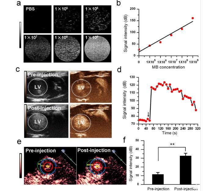 圖2、H2-MBs的超聲信號檢測。(a)H2-MBs分散在各種濃度(5×105、5×106、5×107、5×108和5×109/mL)的PBS中的超聲圖像。使用Vevo 2100超聲成像系統進行成像。(b)PBS中H2-MBs的超聲信號強度的定量分析。(c)大鼠心臟LV中H2-MBs在靜脈尾部注射H2-MBs前后的超聲圖像。使用Vevo 2100超聲成像系統進行成像(n=3)。上排,注射H2-MBs前;下排,注射H2-MBs后;左側面,B模式圖像;右側面,對比模式圖像;LV,左心室(點線循環)。(d)H2-MBs注射進入大鼠后300秒的時間-強度曲線。箭頭表示MB注射的時間。(e)大鼠心肌組織中H2-MB輸送的超聲圖像。使用Philips IE33超聲機進行成像。左側,注射H2-MBs前;右側,注射H2-MBs后;LV,左心室(紅色循環);IVS,心室間隔(藍色循環);RV,右心室(綠色循環)。箭頭表示靜脈注射H2-MBs后H2-MB輸送到大鼠心肌組織中的情況。(f)H2-MBs的超聲信號強度的定量分析。