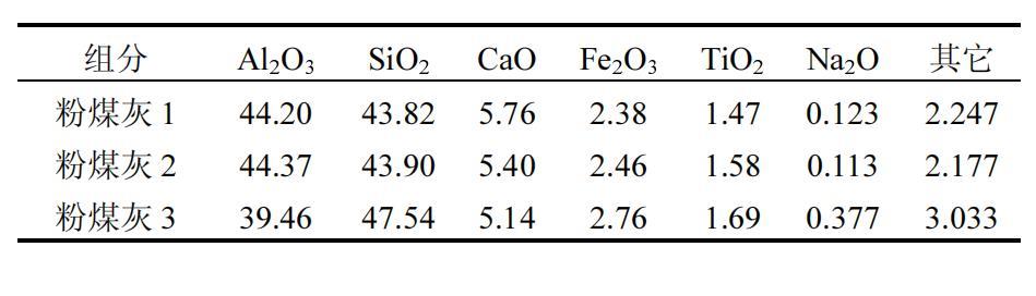 利用3種均來源于內蒙古托克托電廠的粉煤灰(編號分別為粉煤灰1、粉煤灰2和粉煤灰3),其化學組成如表1所示,3種粉煤灰主要含有SiO2和Al2O3,雜質主要為CaO、Fe2O3和TiO2,雜質總占比分別為11.86%、11.87%和12.62%。