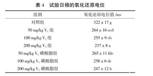 結(jié)果見表4。由表4可見,添加抗氧化劑后,飼料氧化還原電位有所變化,且與添加量有一定量效關(guān)系。說明,在飼料中添加抗氧化劑(VC和VC磷酸脂)可以降低飼料的氧化還原電位。