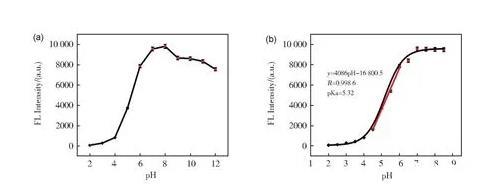 由于pH對所有生命體而言都至關重要,因此精確監測pH的變化至關重要。目前,已開發出多種技術手段用于測定pH值,例如PH微電極、核磁共振、吸收光譜等方法。其中,熒光光譜法由于靈敏度高、信噪比高、響應速度快、成本低、操作簡單和實時監測等優點被廣泛應用于化學生物傳感領域。然而,大多數pH熒光探針都是基于有機小分子熒光團設計合成的,存在光穩定性差、生物相容性差、毒性高、制備過程復雜等缺點,限制了其在生物體系中的廣泛應用。因此,開發用于監測生理環境中pH變化的新型熒光探針對于研究受pH影響的相關的疾病具有重要意義。