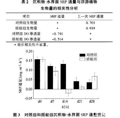 加入搖蚊幼蟲前。搖蚊組和對照組SRP在沉積物一水界面通量相近(圖3)。加入搖蚊幼蟲明顯改變了搖蚊組SRP在沉積物一水界面的通量整個培養過程中,對照組的SRP在沉積物一水界面通量一直下降,從0.156mr,/(m·h)(dO)下降到0.035mg/(m·h)(d28)。搖蚊組在培養前中期,SRP在沉積物一水界面通量比對照組下降更為明顯。從0.156mg/(in·h)(dO)下降到一0.061mg/(131·h)(d14),但在后期回升到0.067mg/(m·h)(d28)(圖3)。相關性分析顯示,上覆水浮游植物生物量與沉積物一水界面SRP通量相關性并不顯著,但是與上一次采樣的SRP通量具有顯著相關性,表明SRP通量對浮游植物的影響具有滯后性(表2)。