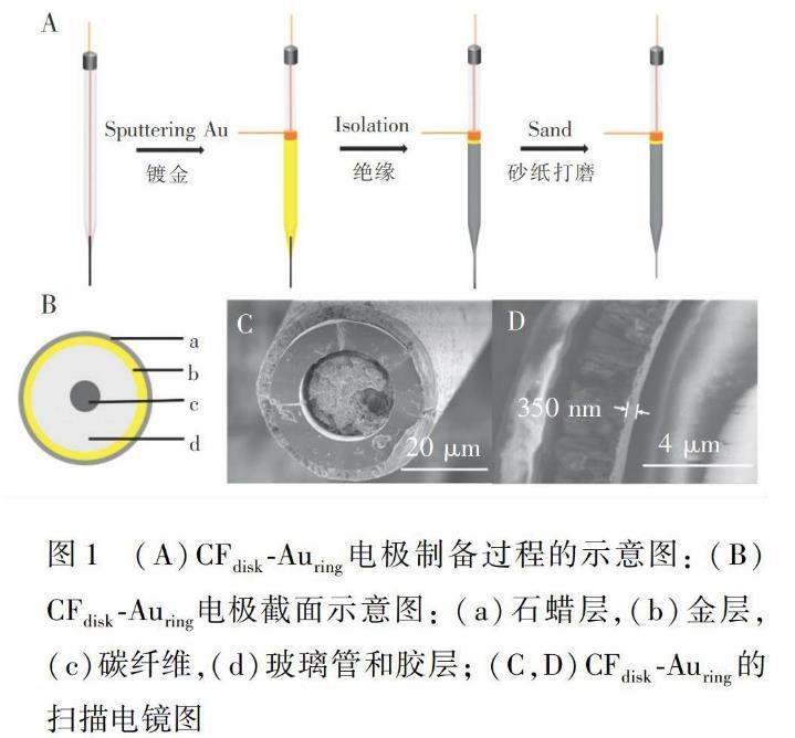 微電極的制備如圖1所示,使用微電極拉制儀在820℃的拉制溫度下將玻璃管(i.d.1.5 mm,L=10 cm)拉制成兩個尖端很細(xì)的毛細(xì)管,拉制完成后,用玻璃刀割開毛細(xì)管尖端,控制端口直徑為20~30μm。將碳纖維用導(dǎo)電銀膠連接到銅絲上,小心穿入到上述制備好的毛細(xì)管中。用502膠將毛細(xì)管兩端封住,放置過夜,使502膠固化,制備成碳纖維電極(CFE)。再將CFE置于磁控濺射鍍膜儀中,在玻璃管外壁鍍金層(約350 nm),取出后用銅絲連接金層,并用蠟封金層絕緣,制成金環(huán)電極。將制備好的CFE Auring電極用2000目砂紙打磨,制成CFdiskAuring電極,超聲,沖洗后備用。