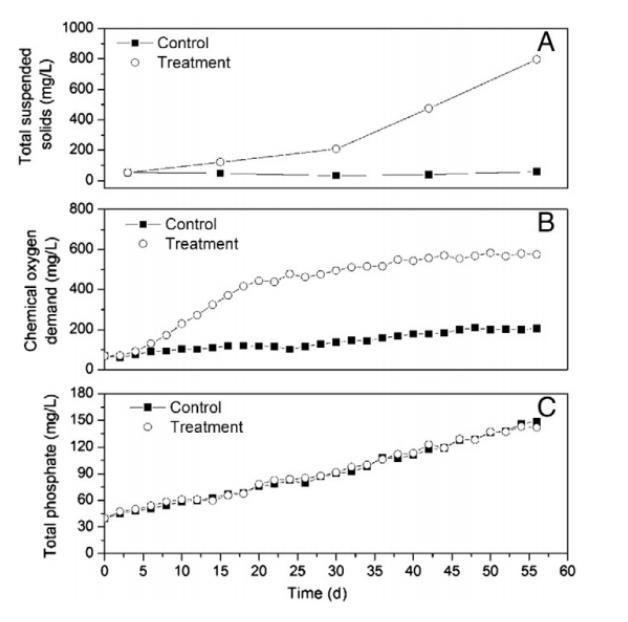 圖3.研究期間處理和控制水箱中總懸浮固體(A)、化學需氧量(B)和總磷(C)濃度的變化。每個參數的值為三次重復樣本的平均值。
