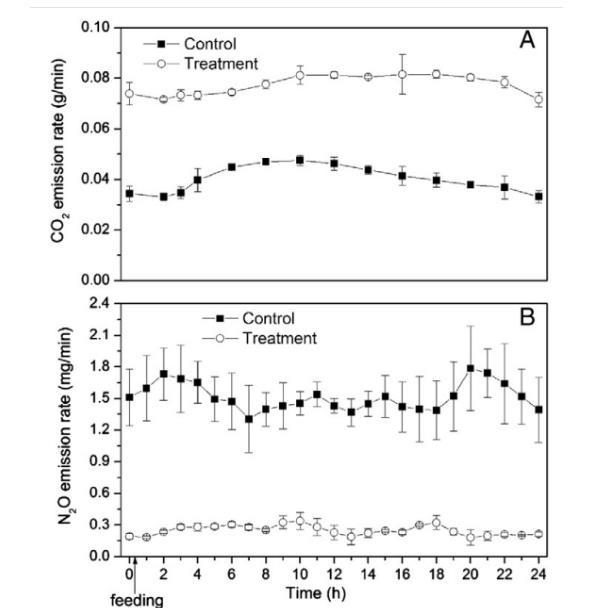 圖4.處理和控制水箱中CO2(A)和N2O(B)排放速率的晝夜變化。每個數據點是不同日期的三次測量的平均值。