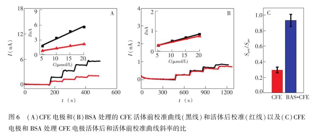 為了克服微電極必須在活體后校準的缺點,Liu等提出了用BSA處理微電極的方法進行活體原位分析,因他們發(fā)現(xiàn)微電極在BSA溶液中,電極的靈敏度會迅速降低,但BSA的濃度大于30 mg/mL時,電極的靈敏度不再下降,即使電極在與BSA電荷相反的蛋白質(zhì)溶液中,電流響應也很穩(wěn)定。基于此,他們在活體檢測前用40 mg/mL BSA處理微電極,結(jié)果表明,活體前校準曲線的靈敏度和活體后校準曲線的靈敏度一致。并且,用BSA處理檢測多巴胺(DA)的CFE和檢測抗壞血酸(AA)的碳納米管修飾CFE,發(fā)現(xiàn)這兩種電極在活體前和活體后的校準曲線都是一致的,這說明了BSA處理的方法具有很好的普適性。該方法為活體電化學方法提供了可靠且簡單的電極前校準的策略(圖6)。