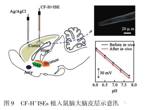 在電化學分析中,蛋白質(zhì)吸附對不同信號輸出方式的影響不同,因此所使用的抗蛋白質(zhì)吸附的方法也不同。Hao等發(fā)展了一種具有高抗蛋白質(zhì)吸附性能的電位型傳感器可用于直接監(jiān)測鼠腦中pH的變化。該電極通過使用H+選擇性膜(H+ISM)和含有增塑劑雙(2乙基己基)癸二酸酯,H+離子載體三癸胺和離子交換劑鉀四(4氯苯基)的聚氯乙烯聚合物基質(zhì)制備。體外和體內(nèi)研究均表明,CF H+ISEs電極具有很強的抗蛋白質(zhì)吸附性能,CF H+ISE能夠在活體檢測后保持和活體前相同的靈敏度和可逆性(圖9)。