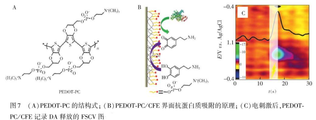 在提高微電極的抗蛋白吸附能力的同時保持微電極的靈敏度對活體檢測極其重要,Liu等進一步設計了聚合物單體EDOT PC(兩性離子磷酸膽堿官能化的乙烯二氧噻吩),并通過電化學聚合法將其可控地聚合在微電極表面,形成了具有類細胞膜結(jié)構(gòu)的PEDOT PC超薄膜。其中由于PC端的電化學聚合自限制,形成了非常薄的PEDOT PC膜,保證了待檢測物在膜內(nèi)的快速傳質(zhì)。因此,PEDOT PC修飾的微電極不僅能夠有效地抗蛋白質(zhì)的非特異性吸附,而且能保持電極的檢測靈敏度。利用PEDOT PC修飾的CFE準確監(jiān)測了大鼠腦內(nèi)KCl刺激,以及電刺激過程中DA的釋放。該研究有效解決了微電極在活體原位分析中蛋白質(zhì)吸附的關鍵問題,為更好地研究腦神經(jīng)化學的分子機制奠定了重要基礎(圖7)。