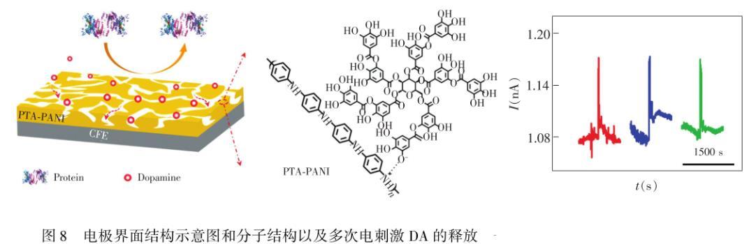 在微電極的表面構(gòu)筑特殊結(jié)構(gòu)也是有效克服蛋白質(zhì)吸附造成分析性能下降的有效途徑。Zhou等在CFE表面構(gòu)筑了一個高孔隙率的、有序的二氧化硅抗污染薄膜(SNM)。SNM能夠有效地防止蛋白質(zhì)進入到通道中引起CFE電極表面的生物污染,同時對O2的擴散具有高滲透性。活體實驗表明:SNM/CFE可連續(xù)監(jiān)測O2且能夠保持對其高的分析靈敏度和快速響應。為了能夠在構(gòu)筑多孔結(jié)構(gòu)的同時又具有高的親水性能,F(xiàn)eng等報道了一種聚單寧酸(PTA)摻雜的納米多孔導電聚苯胺(PANI)膜涂層,其中PANI構(gòu)筑了多孔的結(jié)構(gòu),PTA的摻雜不僅使得PANI在中性溶液中保持了導電能力,而且PTA的多羥基使得構(gòu)筑的PTA PANI多孔膜親水性能更強,并對DA具有很強的富集能力。所制備的PTA PANI修飾的CFE表現(xiàn)出高的抗蛋白吸附的能力,活體前和活體后DA的校準曲線靈敏度基本一致,并且活體檢測DA的釋放具有高的穩(wěn)定性(圖8)。