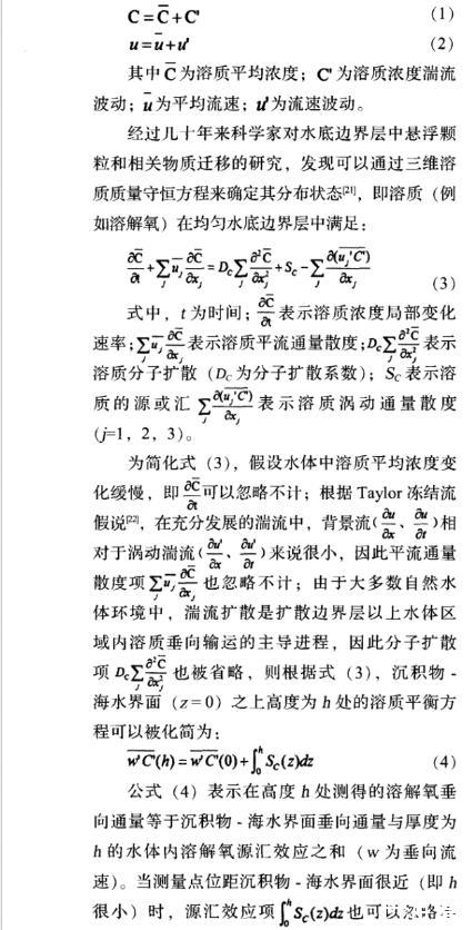 經過幾十年來科學家對水底邊界層中懸浮顆粒和相關物質遷移的研究,發現可以通過三維溶質質量守恒方程來確定其分布狀態,即溶質(例如溶解氧)在均勻水底邊界層中滿足: