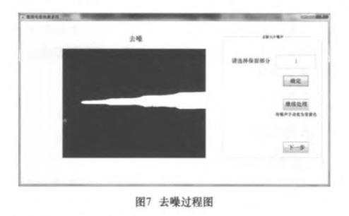在經(jīng)過上述處理之后,大部分電極圖片的噪聲都被去除,可以進(jìn)行輪廓提取工作,但少部分圖片的背景中依然存在大片噪聲。使用bwlabel函數(shù)標(biāo)注圖像中的連通域,再用regionprops函數(shù)計算出各連通域的周長,系統(tǒng)檢測整幅圖片后在各個連通域的中間以紅色標(biāo)號。處理好后,操作者在GUI中選擇需要保留的電極部分,系統(tǒng)就會自動刪除剩余的噪聲部分(圖7)。經(jīng)過噪聲處理,電極圖像的處理工作全部完成,系統(tǒng)可提取電極輪廓。