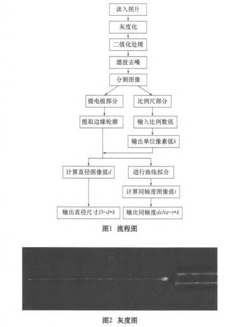 本文基于數(shù)字圖像處理的理論基礎(chǔ),以Windows操作系統(tǒng)為開發(fā)平臺,MATLAB作為編程工具,設(shè)計微電極的自動檢測系統(tǒng),實(shí)現(xiàn)讀入電子顯微鏡下原始圖片,通過一系列處理輸出直徑尺寸與同軸度誤差。本文的主要研究內(nèi)容如下: