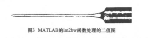 閾值的選取決定了二值化處理的效果,是后續(xù)一系列圖像處理的基礎(chǔ)。在MATLAB中有專門的二值化處理函數(shù)im2bw,它將在未設(shè)定閾值時自動選擇一閾值進(jìn)行二值化。但應(yīng)用到圖像中的效果如圖3所示。