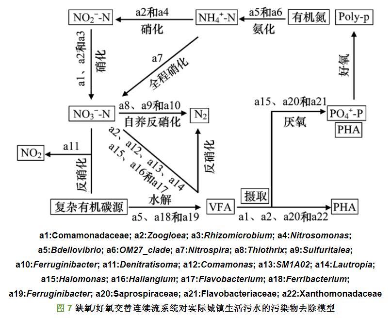 結合功能菌群的分類結果,建立缺氧/好氧交替連續流系統對實際城鎮生活污水的污染物去除模型如圖7,首先生活污水中的復雜有機物首先通過Ferribacteriu屬和Ferruginibacter屬水解為VFA.污水中的氮分為有機氮和無機氮,污水中的有機氮通過Bdellovibrio屬和OM27_clade屬的氨化作用分解含氮有機化合物釋放NH4+-N,這些細菌具有循環利用有機氮的作用,其中OM27_clade屬隸屬于球孢菌科(Bdellovibrionaceae)的OM27進化枝成員,是未經培養的微生物群。污水中的NH4+-N通過Zoogloea屬及Nitrosomonas屬硝化成NO2--N,其由Comamonadaceae科、Zoogloea屬和Rhizomicrobium屬進一步硝化成NO3--N,同時還有全程硝化細菌Nitrospira屬同時擁有氨氧化功能和亞硝酸氧化功能,將NH4+-N硝化成硝氮。緊接著污水中NO3--N反硝化成為N2,在顆粒污泥中發現了幾種反硝化細菌,第一種是利用VFA進行反硝化的細菌,有以VFA中的乙酸為碳源進行反硝化的Halomonas屬和Comamonas屬、也有利用其它VFA進行反硝化的Zoogloea屬、SM1A02屬、Lautropia屬、Haliangium屬和Flavobacterium屬,第二種是自養反硝化細菌,有利用硫基進行自養反硝化的Thiothrix屬和Sulfuritalea屬,也有利用鐵進行自養反硝化的Ferruginibacter屬,第三種是直接利用污水中復雜有機碳源進行反硝化的Denitratisoma屬。可見,由于實際生活污水中的有機碳大部分以復雜化合物(如蛋白質,脂類和多糖)的形式存在,所以在連續流系統中發現了多種利用不同碳源的反硝化細菌,促進了生活污水中各種碳源的利用。
