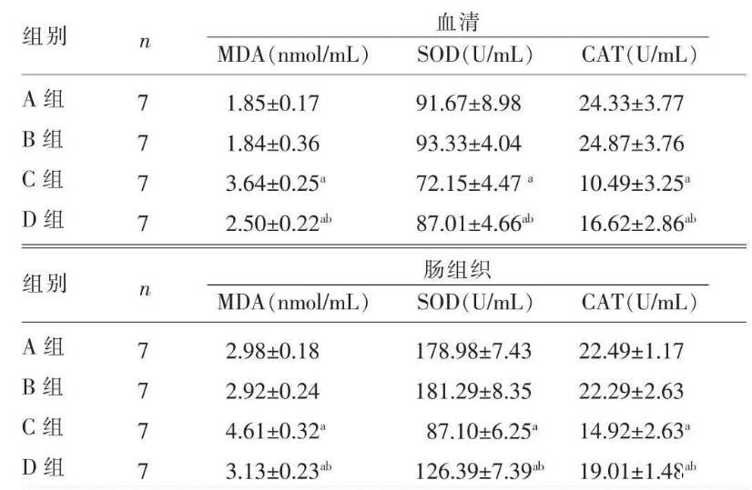 目的觀察氫氣吸入對重度膿毒癥小鼠腸黏膜屏障功能、腸道組織氧化還原狀態(tài)的影響,并探討其機制。方法選取美國癌癥研究所雄性小鼠56只,體質(zhì)量20~25 g,均為5周齡,采用隨機數(shù)字表法將其分為四組:假手術組(A組)、假手術+氫氣組(B組)、膿毒癥組(C組)和膿毒癥+氫氣組(D組),每組14只。采用盲腸結扎穿孔(CLP)法制備小鼠膿毒癥模型。B組和D組于CLP后1、6 h吸入2%氫氣1 h。CLP后24 h進行行為學評分;采集靜脈血檢測血中生化指標[丙氨酸氨基轉移酶(ALT)、天門冬氨酸氨基轉移酶(AST)、尿素氮(BUN)、肌酐(Cr)];隨后處死小鼠取中段空腸,對腸道組織進行原位末端脫氧核苷酸轉移酶標記法(TUNEL)染色,觀察腸道組織細胞凋亡情況并評分;檢測血液及腸道組織勻漿中丙二醛(MDA)水平及過氧化氫酶(CAT)、超氧化物歧化酶(SOD)的活力。結果與A組比較,C組和D組行為學評分、腸道組織凋亡指數(shù)、血生化指標(ALT、AST、BUN、Cr)水平及血清和腸道組織MDA水平升高,SOD和CAT活力降低,差異均有統(tǒng)計學意義(P<0.05),而B組上述指標與A組比較,差異均無統(tǒng)計學意義(P>0.05);與C組比較,D組行為學評分、腸道組織凋亡指數(shù)、血生化指標水平及血清和腸道組織MDA水平降低,SOD和CAT活力升高,差異均有統(tǒng)計學意義(P<0.05)。結論氫氣吸入對重度膿毒癥小鼠腸損傷和腸黏膜屏障功能破壞有明顯保護作用,可能與其抗凋亡作用及對內(nèi)源性氧化還原平衡狀態(tài)的維持有關。