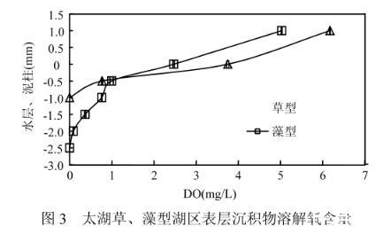 圖3是由溶氧微電極測得的草、藻型湖區沉積物表層DO濃度剖面,可以看到,草型湖區沉積物表面的溶解氧高于藻型,但隨后迅速下降,在泥下1mm處即檢測不到溶解氧。而在藻型湖區的沉積物中,溶解氧在泥下0.5——1mm處出現迅速下降的趨勢,直到泥下2.5mm處才趨于0,溶氧層厚度明顯高于草型。