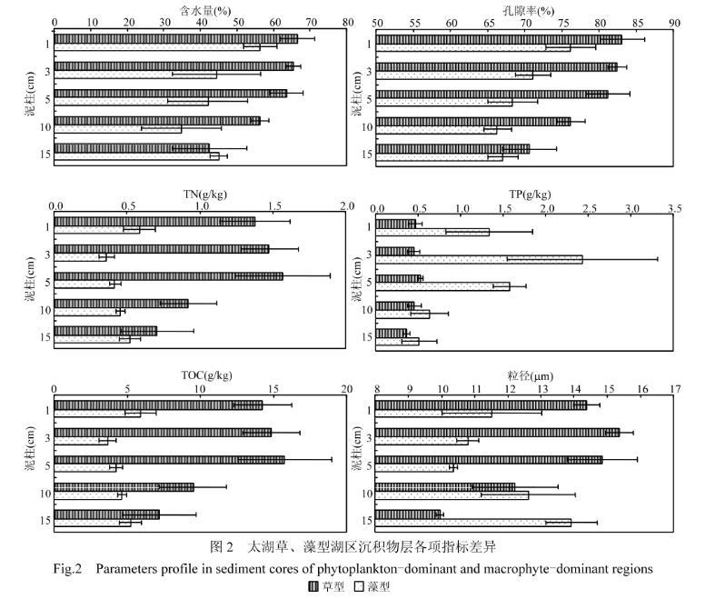 草、藻型湖區沉積物各層指標如圖2所示。草、藻型湖區沉積物的含水量與孔隙率都大致呈逐漸遞減的趨勢,草型稍高于藻型。草型湖區沉積物的TN和TOC顯著高于藻型,且都在3——5cm處出現增高或降低的拐點。而沉積物的TP則表現為藻型湖區顯著高于草型湖區,但也在3——5cm處出現了拐點。兩類湖區間的沉積物中值粒徑沒有顯著差異,各層均值都在9——16μm之間。同樣可以觀察到,中值粒徑在3——5cm處發生增大或變小的改變。