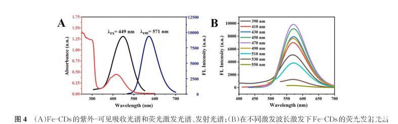 圖4(a)Fe-CDs的紫外-可見(jiàn)吸收光譜和熒光激發(fā)光譜、發(fā)射光譜;(b)在不同激發(fā)波長(zhǎng)激發(fā)下Fe-CDs的熒光發(fā)射光譜