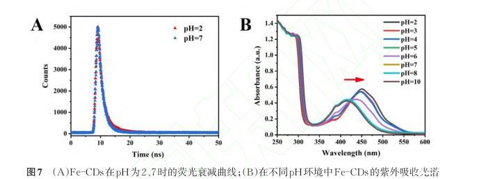 圖7(a)Fe-CDs在pH為2、7時(shí)的熒光衰減曲線;(b)在不同pH環(huán)境中Fe-CDs的紫外吸收光譜