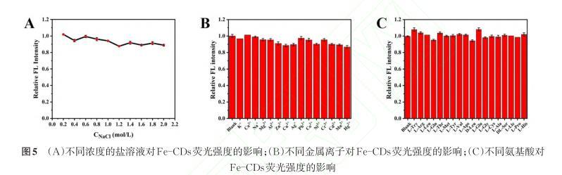 為了研究Fe-CDs的熒光穩(wěn)定性,考察了不同離子強(qiáng)度、金屬離子及氨基酸對(duì)Fe-CDs熒光強(qiáng)度的影響。如圖5(a),以不同濃度NaCl溶液模擬不同離子強(qiáng)度環(huán)境,當(dāng)NaCl溶液濃度高達(dá)到2.0 mol/L時(shí),熒光強(qiáng)度依然可維持原始熒光強(qiáng)度的90%以上,表明Fe-CDs具有良好的離子穩(wěn)定性和抗鹽能力。如圖5(b)和5(c)所示,當(dāng)Fe-CDs分別與15種不同的金屬離子及17種不同的氨基酸共存時(shí),F(xiàn)e-CDs熒光強(qiáng)度幾乎不受各種共存物質(zhì)的影響,表明Fe-CDs有比較強(qiáng)的光穩(wěn)定性。