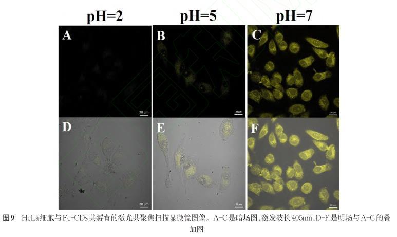 由于Fe-CDs具有良好的光學(xué)性能及穩(wěn)定的生物相容性,探索了其作為熒光探針在監(jiān)測(cè)細(xì)胞內(nèi)pH的可能性。用人宮頸癌HeLa細(xì)胞為模型,將濃度為0.1 mg/mL的不同pH值的(pH=2,5,7)Fe-CDs與HeLa細(xì)胞共孵育半小時(shí)進(jìn)行細(xì)胞成像實(shí)驗(yàn),觀察細(xì)胞形態(tài)變化以及細(xì)胞內(nèi)熒光變化。如圖9所示,F(xiàn)e-CDs分布于細(xì)胞膜、細(xì)胞質(zhì)甚至細(xì)胞核區(qū)域,說(shuō)明Fe-CDs具有良好的細(xì)胞通透性。當(dāng)pH為7時(shí),細(xì)胞內(nèi)的熒光強(qiáng)度最強(qiáng)(c和f);當(dāng)pH為5時(shí),F(xiàn)e-CDs的熒光強(qiáng)度部分猝滅(b和e);當(dāng)pH為2時(shí),F(xiàn)e-CDs的熒光強(qiáng)度幾乎全部被猝滅(a和d)。這與體外實(shí)驗(yàn)結(jié)果一致,也進(jìn)一步表明了Fe-CDs可作為一種良好的pH熒光探針用于細(xì)胞內(nèi)pH水平的監(jiān)測(cè)。