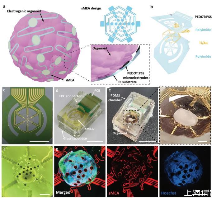 a)由具有突出微電極的sMEA捕獲的類器官的概念圖。B)sMEA的分解圖。c)所制造的sMEA的光學圖像。刻度尺,5 mm。d)包裝的sMEA的光學圖像。刻度尺,1cm。e)支持具有高位移的類器官的sMEA的光學圖像。比例尺,分別為1 cm和1 mm。f)sMEA底視光學顯微鏡圖像,其中類器官在頂部。比例尺,1mm.g)具有中腦類器官的sMEA的3D重建熒光圖像。紅色和藍色分別對應于sMEA(R6G)和細胞核(Hoechst)。刻度尺,1 mm。