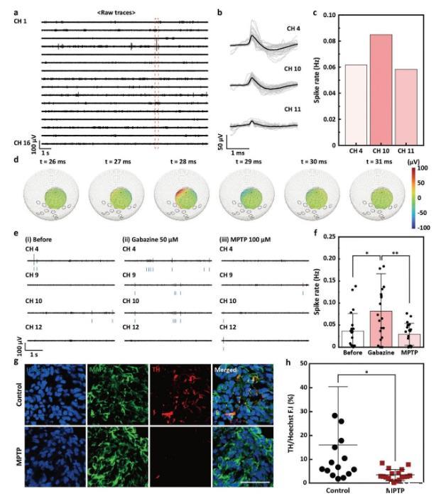 a)在成熟50天后,從中腦類器官測量的電生理信號的原始電壓跡線。B)分類的神經棘波波形和c)從通道4、10和11記錄的原始電壓跡線提取的棘波率。d)從a)中的紅色虛線框中所示的信號重建的3D時空彩色圖圖像。e)在藥物治療前(i)、用加巴嗪(50μm)治療后(ii)和在加巴嗪治療后(iii)進行MPTP(100μm)治療后,從通道4、9、10和12測量的電生理信號的原始電壓跡線(上)和光柵圖(下)。f)比較藥物治療前、加巴嗪(50μm)治療后和后續MPTP(100μm)治療后的峰率。(n=3)(平均值±S.D.,*p<0.05,和**p<0.01,單因素方差分析)。g)顯示神經標記物(MAP2)和多巴胺能神經元標記物(TH)在對照和MPTP(100μm)處理的mBO中的表達的代表性免疫熒光圖像。比例尺,50μm。h)兩組中TH陽性細胞的定量。對于熒光計數器,使用Hoechst。(n=6)(平均值±S.D.,*p<0.05,非配對t檢驗)。