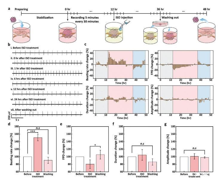 a)用心臟球體進行的藥物治療實驗的示意圖和時間軸。B)ISO處理后,隨時間推移的電生理信號的原始電壓跡線。c)ISO處理后,搏動率、場電位持續時間、持續時間和峰-峰振幅隨時間的變化。灰色、紅色和藍色框分別表示ISO處理前、ISO處理后和沖洗后。ISO處理前、ISO處理后1小時和沖洗后1小時的d)搏動率、e)場電位持續時間、f)持續時間和g)峰-峰振幅的變化。(n=3)(平均值±S.D.,*p<0.001,單因素方差分析)。