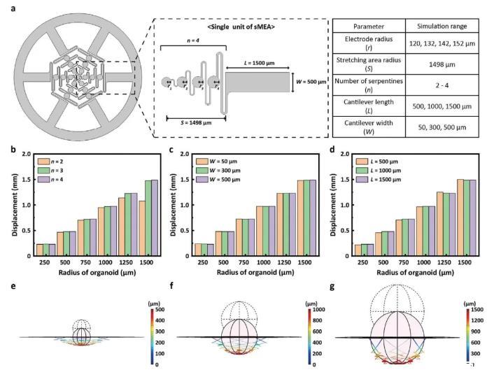 a)具有最終優化值的sMEA的結構和設計參數。sMEA的最大位移與B)不同數量的蛇紋(n=2,3,和4),c)寬度的杠桿(W=50,300,和500μm),和d)長度的杠桿(L=500,1000,和1500μm)為不同大小的forganoids。FEM模擬結果的側視圖描繪了當將半徑為e)500μm、f)1000μm和g)1500μm的類器官放置在頂部時sMEA上的位移。