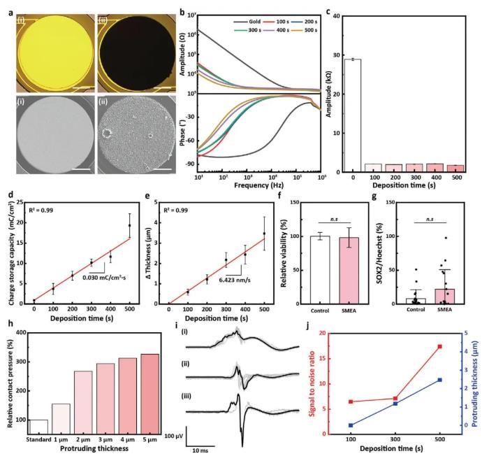 a)在PEDOT:PSS電沉積之前(i)和在PEDOT:PSS電沉積之后(ii)的微電極的光學顯微鏡圖像(上)和SEM圖像(下)。比例尺,50μm。b)在不同的PEDOT:PSS電沉積時間下的電化學阻抗譜。c)在不同的PEDOT:PSS電沉積時間下,在1kHz下的電化學阻抗的比較。(n=13)(平均值±標準差。)d)相對于PEDOT:PSS電沉積時間的電荷存儲容量。(n=13)(平均值±標準差。)e)在不同的PEDOT:PSS電沉積時間之后的厚度變化。(n=7)(平均值±標準差)f)中腦類器官的相對活力。(n=3)(平均值±S.D.,非配對t檢驗)g)對照組和sMEA組中SOX2陽性細胞的定量。使用Hoechst進行細胞核染色,并在每個類器官中定量至少3個圖像。(n=6)(平均值±S.D.,非配對t檢驗)h)與標準MEA相比,相對于突出電極的厚度的相對接觸壓力變化。i)分別在100 s(i)、300 s(ii)和500 s(iii)時,從涂覆有PEDOT:PSS的sMEA上的心臟球體測量的動作電位信號。j)i)中測量的信號的信噪比。
