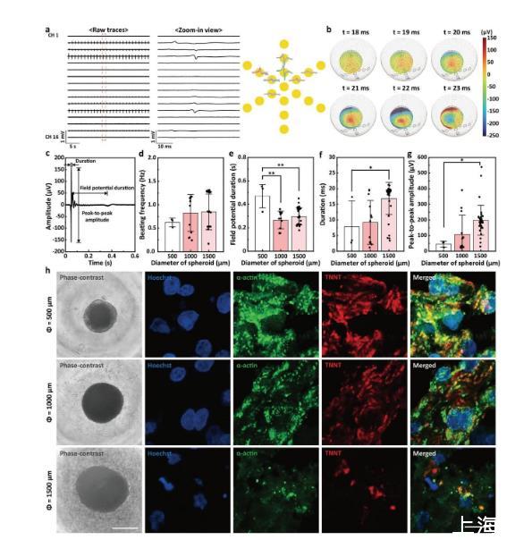 。a)從直徑為1500μm的心臟球體測量的電生理信號的原始電壓跡線(左),圖中紅色虛線框的放大視圖(左)(中),以及從每個微電極測量的分類動作電位的表示(右)。B)從在a)中心示出的信號重構的3D時空色彩映射圖像。使用鄰近測量的信號對每個微電極之間的未測量信號進行線性內插。c)在直徑為1500μm的心臟類球體中測量的平均動作電位的代表性原始跡線及關鍵參數。d)搏動頻率,e)場電位持續時間,f)持續時間,g)從直徑為500μm、1000μm和1500μm的心臟球形體中測量的電生理信號中提取的峰-峰振幅。(n=3)(平均值±S.D.,*p<0.05,**p<0.01,單因素方差分析)h)心臟類球體大小的代表性相差圖像(比例尺,500μm)和相應的免疫熒光圖像,顯示分化的心臟類球體中的β-肌動蛋白和TNNT的表達。比例尺,10μm。