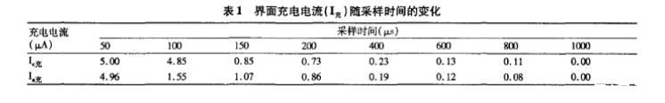在50—1000p.s間逐漸增加采樣時間,分別采集相應的陰極和陽極充電電流信號(I。補I充),結果如表1所示。