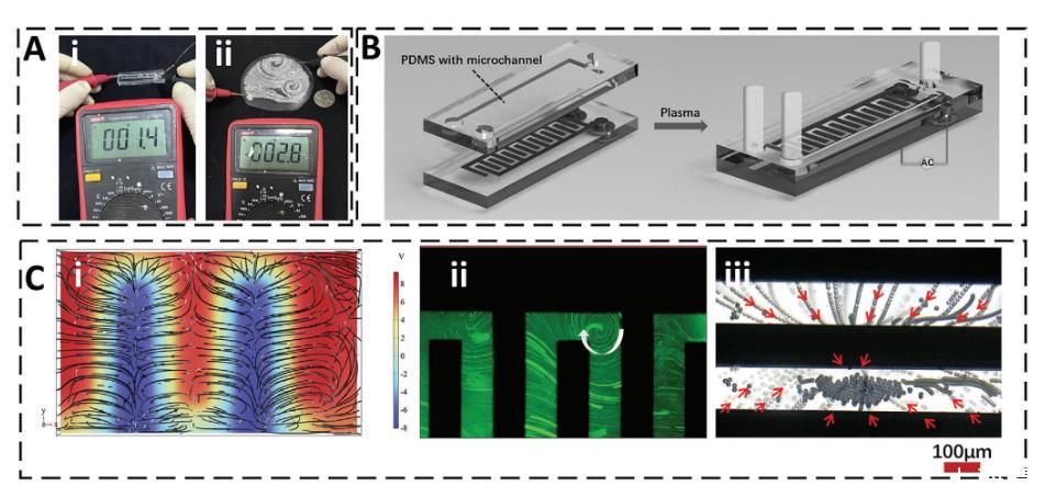 圖3.μLME電氣特性。A)(i)簡單條形電極電阻值為1.4Ω,(ii)整體直徑約為91.4毫米的螺旋電極(圖案來自梵高“星月夜“)的電阻值僅為2.8Ω。B)μLME與PDMS通道鍵合示意圖。C)(i)電滲流數(shù)值模擬和(ii)(iii)微粒驅(qū)動實驗。