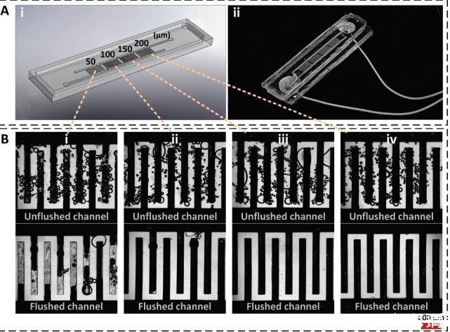 圖4.用低頻電壓測試不同嵌入厚度的芯片。A)3D打印模型(i)和制造和粘合的(ii)芯片。B)施加10 kHz、10 Vpp電壓30秒后(i)50μm(ii)100μm(iii)150μm,以及(iv)200μm厚度電極的損壞程度。