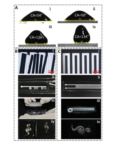 圖2.液態(tài)鎵在不同表面上的沖擊潤濕和電極制造效果。A)液態(tài)鎵從一定高度沖擊(i)PDMS、(ii)玻璃、(iii)硅烷化玻璃和(iv)覆蓋有PNIPAM薄膜的硅烷化玻璃的表面。B、C)分別在其他基底上和已經(jīng)通過本文方法處理的基底上制造的微電極。(i)微電極的顯微鏡視圖。(ii)、(iii)和(iv)是不同圖案照片。