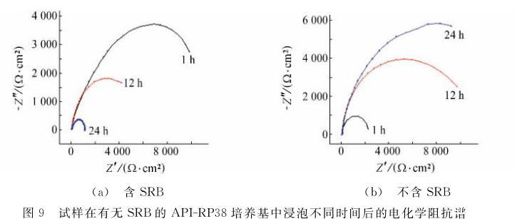 (4)EIS結果表明:含SRB溶液中,隨著浸泡時間的延長,Rf、Rct下降,腐蝕加速;不含SRB溶液中,隨著浸泡時間的延長,H2S腐蝕產生的均勻腐蝕產物膜使Rf、Rct變大,腐蝕減弱。