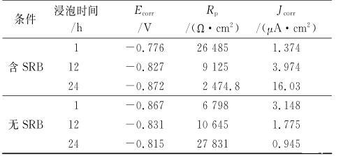 由圖8可見:在浸泡初期,試樣在含SRB的API-RP38培養基中的自腐蝕電位(Ecorr)高于在不含SRB溶液中的,隨著浸泡時間的延長,在含SRB的API-RP38培養基中,試樣的Ecorr開始下降,腐蝕電流密度(Jcorr)有所增加。而在無SRB條件下,隨著浸泡時間的延長,試樣的Ecorr正移,Jcorr減小。用外推法對曲線進行擬合,結果見表2。