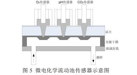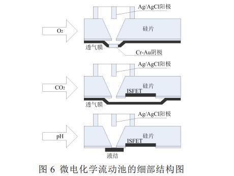 微電化學流動池集成傳感器以其高集成度著稱,能在緊湊的體積內(1 cm×0.6 cm×0.8 cm)實現多種傳感器的集成。這一設計使得在有限的空間內可以同時構建O2傳感器、CO2傳感器以及基于ISFET的pH傳感器,從而實現對不同氣體和離子濃度的實時監測。示意圖如圖5所示。